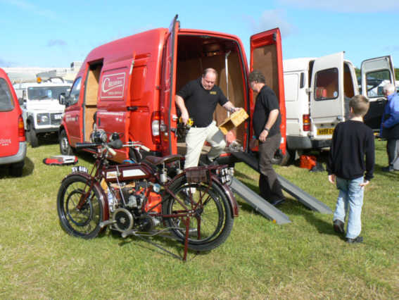 This year the weather was perfect for the run. Here we see Mark and Matthew Scale unloading the two New Scale motorcycles keenly watched by Mark's son Sam. |