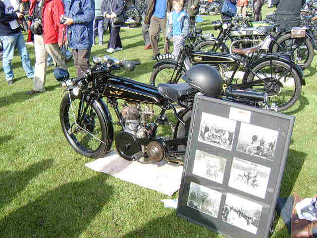 The New Scale Bradshaw 350c.c. T.T. motorcycle arrives at the assembly area before the start of parade.