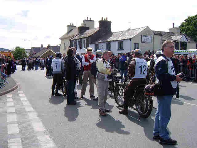 The start was delayed because of two parked cars on the track near Peel, both Manx registered, much to the annoyance of the organizers. So instead of the scheduled start of 10 a.m. the start didn't take place until 1 hour later. |